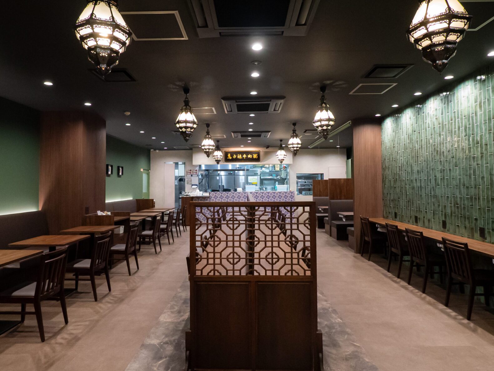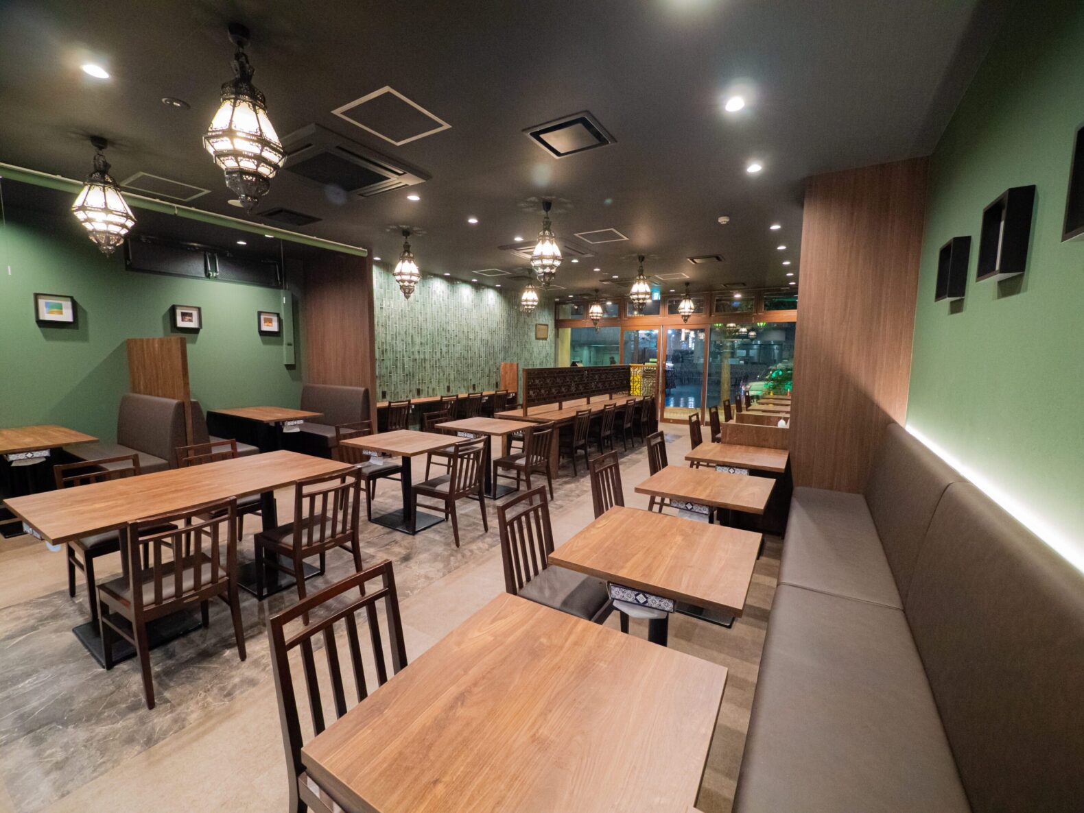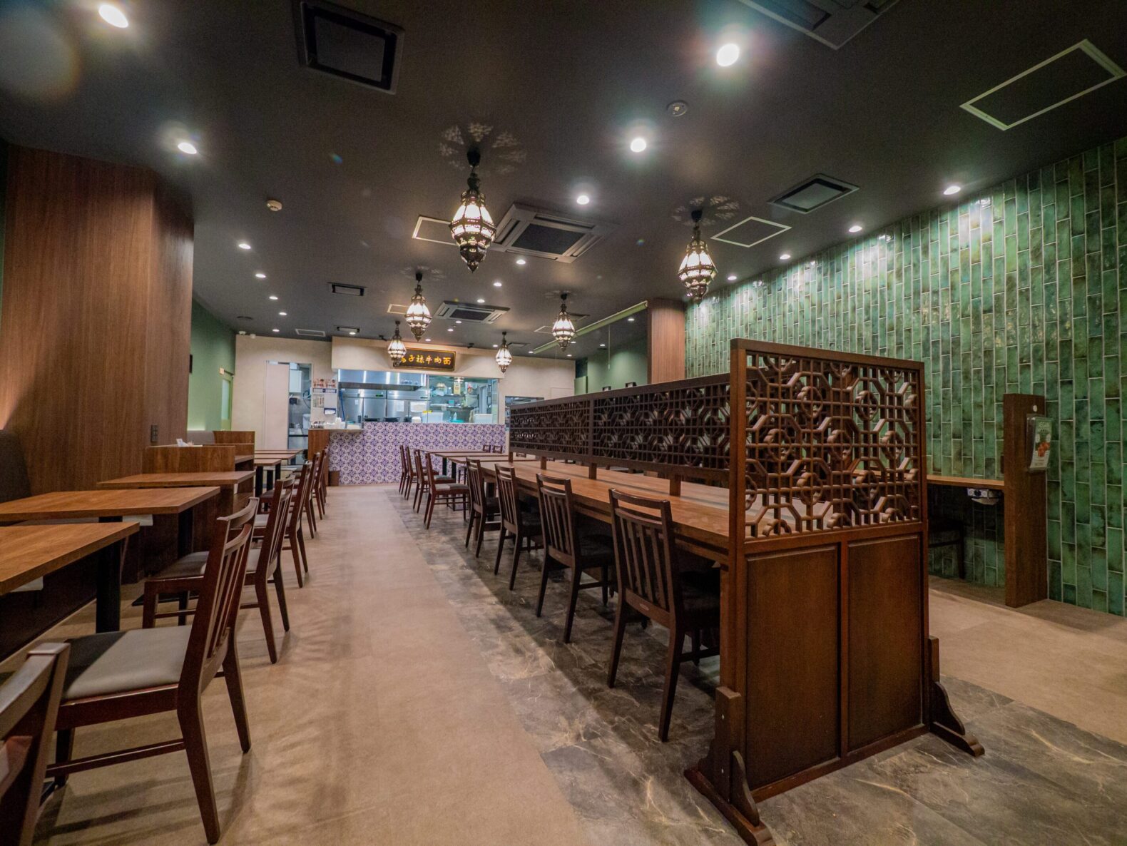 深緑のタイルと壁面が上質な落ち着きを醸し出し、ランタン調の照明が温もりを添えます。