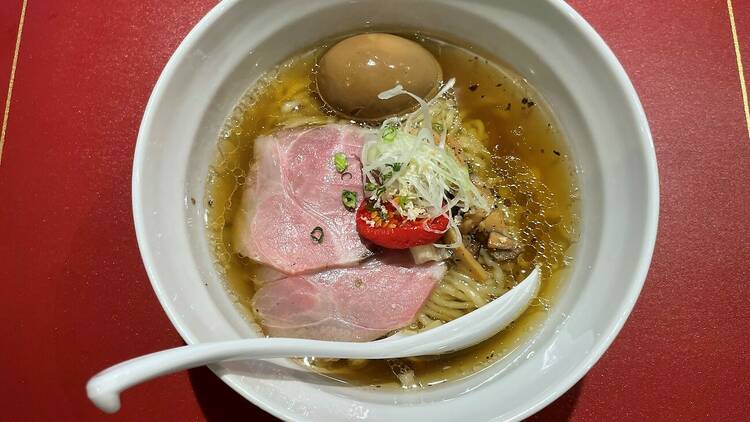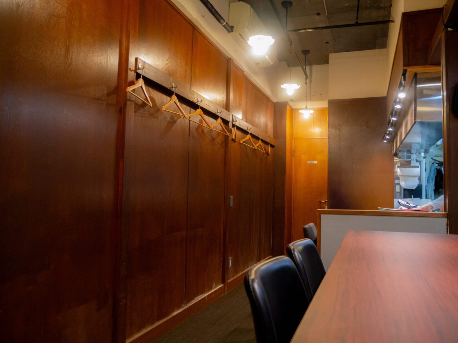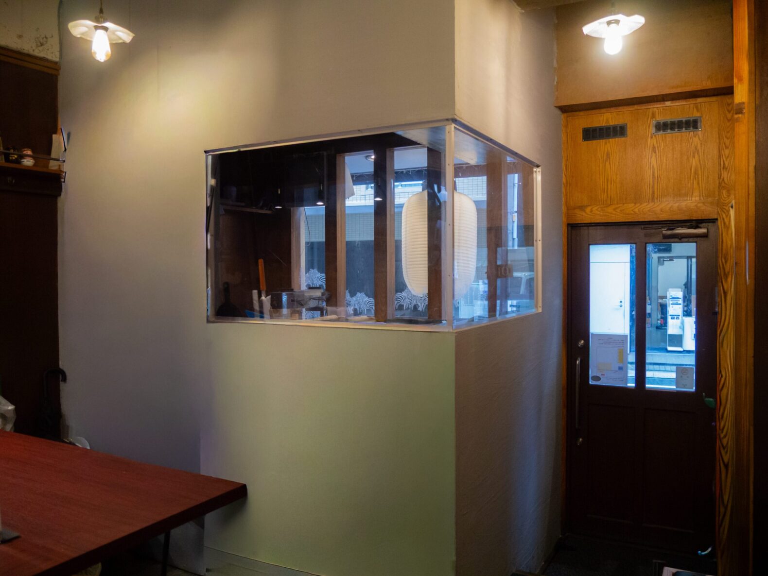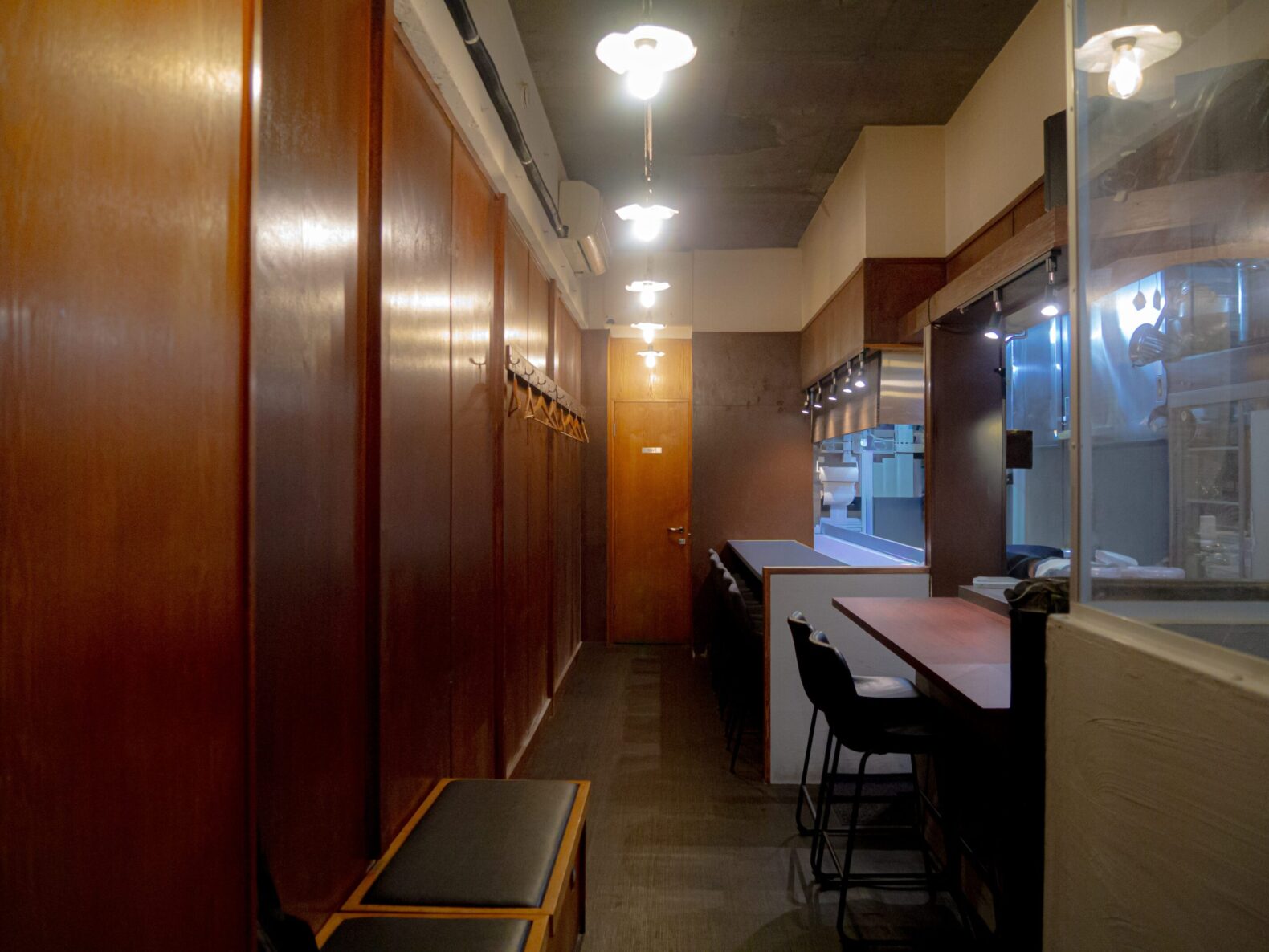 青の外観が街に映え、店内は木の落ち着いた質感でまとめたシンプルな空間。カウンターのみの構成が、味覚と空間の一体感を生み出します。店内に製麺所を設け、店主自らが麺を手づくりする姿もこの空間の一部としてデザインしました。